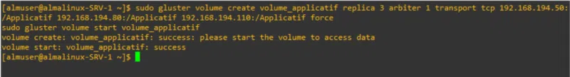 sudo gluster volume create volume_applicatif replica 3 arbiter 1 transport tcp 192.168.194.50:/Applicatif 192.168.194.80:/Applicatif 192.168.194.110:/Applicatif force