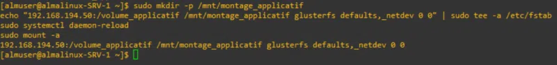 echo "192.168.194.50:/volume_applicatif /mnt/montage_applicatif glusterfs defaults,_netdev 0 0" | sudo tee -a /etc/fstab