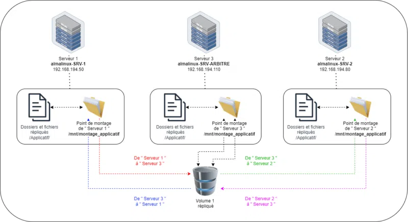 Sur chaque serveur, les fichiers contenus dans "/Applicatif/" seront répliqués dans le point de montage, ici "/mnt/montage_applicatif". Puis, répliqués dans chaque point de montage de chaque serveur, et enfin répliqués vers "/Applicatif/" de chaque serveur.