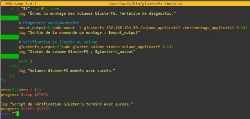 Ce script vérifie l'état du service GlusterFS, des pairs et du volume, il démarre les services et monte le volume si nécessaire, puis enregistre toutes les actions dans un fichier de log. Afin de pouvoir l'utiliser, vous devez l'adapter avec vos informations (noms de serveurs, volumes, etc.).