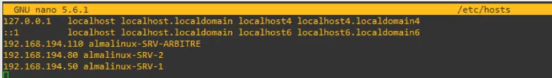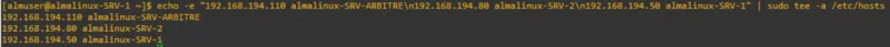 echo -e "192.168.194.110 almalinux-SRV-ARBITRE\n192.168.194.80 almalinux-SRV-2\n192.168.194.50 almalinux-SRV-1" | sudo tee -a /etc/hosts