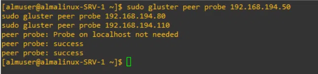 Ces commandes permettent à chaque serveur de reconnaître les autres serveurs comme pairs dans le cluster GlusterFS.