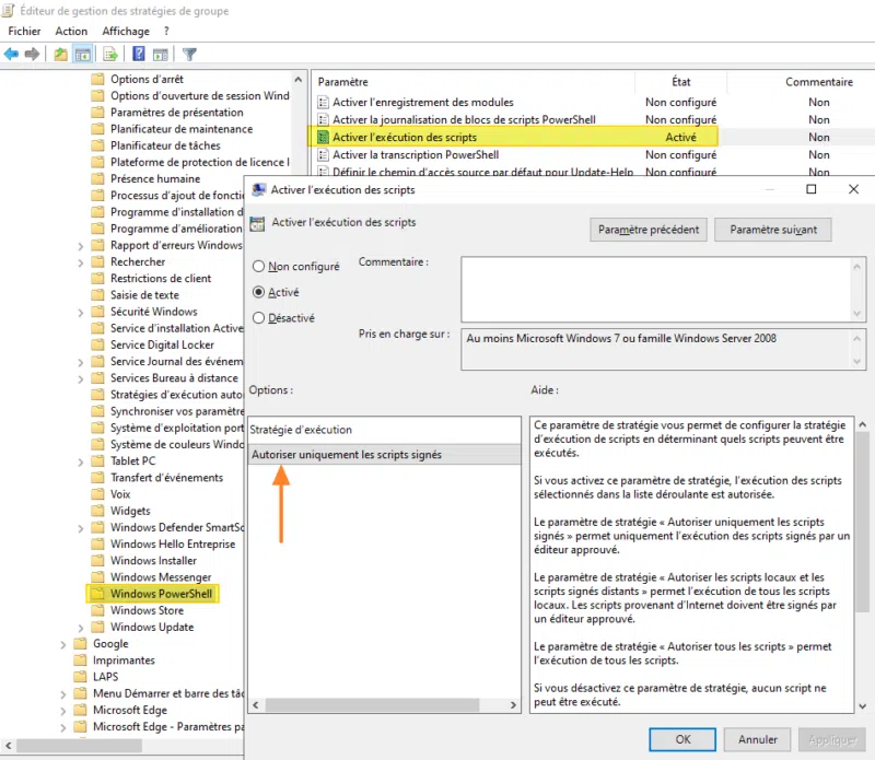 De ce fait, en plus de configurer ce paramètre, vous devez configurer la stratégie d'exécution de Windows PowerShell. Il s'agit du paramètre "Activer l'exécution des scripts". La stratégie recommandée est "AllSigned" pour autoriser uniquement les scripts signés.