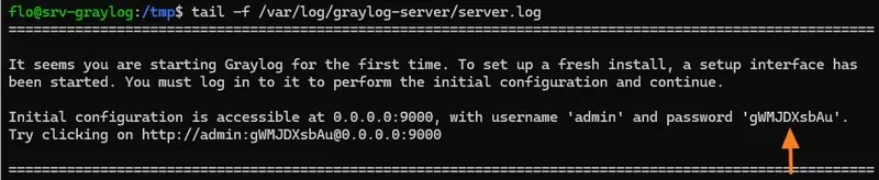 La commande « tail -f /var/log/graylog-server/server.log » n’affiche aucun mot de passe par défaut.