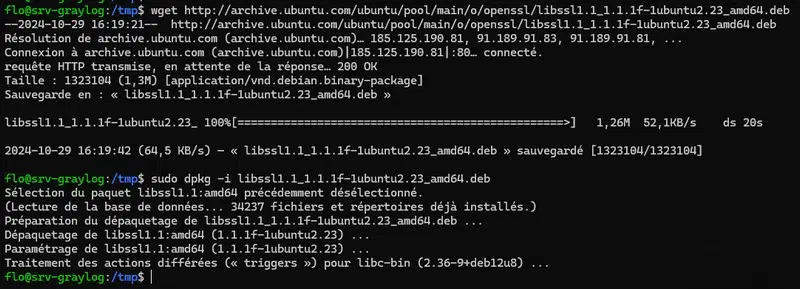 Nous allons télécharger le paquet DEB nommé "libssl1.1_1.1.1f-1ubuntu2.23_amd64.deb" (version la plus récente) avec la commande wget, puis procéder à son installation via la commande dpkg. Ce qui donne les deux commandes suivantes :