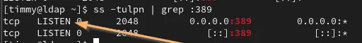 Vérifiez que le serveur est bien en écoute sur le port 389, du protocole LDAP, avec la commande ss suivante :