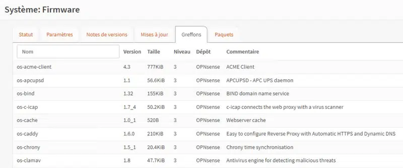 Ceci n'est qu'un aperçu des fonctionnalités proposées par OPNsense. De plus, le catalogue de paquets accessibles depuis l'interface d'administration d'OPNsense permet d'enrichir le firewall de fonctionnalités additionnelles. Par exemple, nous retrouvons : un client ACME, un agent Wazuh, le service de NTP Chrony, ou encore Caddy en tant que reverse proxy.