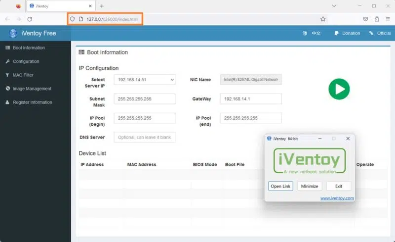 Si nécessaire, cliquez sur "Open Link" pour accéder à l'interface de gestion d'iVentoy. Il s'agit d'une interface web accessible en locale à l'adresse suivante :