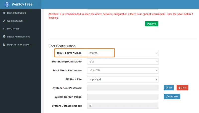 Pour utiliser un serveur DHCP externe, vous devez configurer l'option "DHCP Server Mode" et ne pas utiliser le mode "Internal". Vous devez alors configurer l'option DHCP 66 avec l'adresse IP du serveur iVentoy et l'option DHCP 67 avec la valeur "iventoy_loader_16000". Pour information, le "16000" dans le nom correspond au numéro de port par défaut de l'interface web.