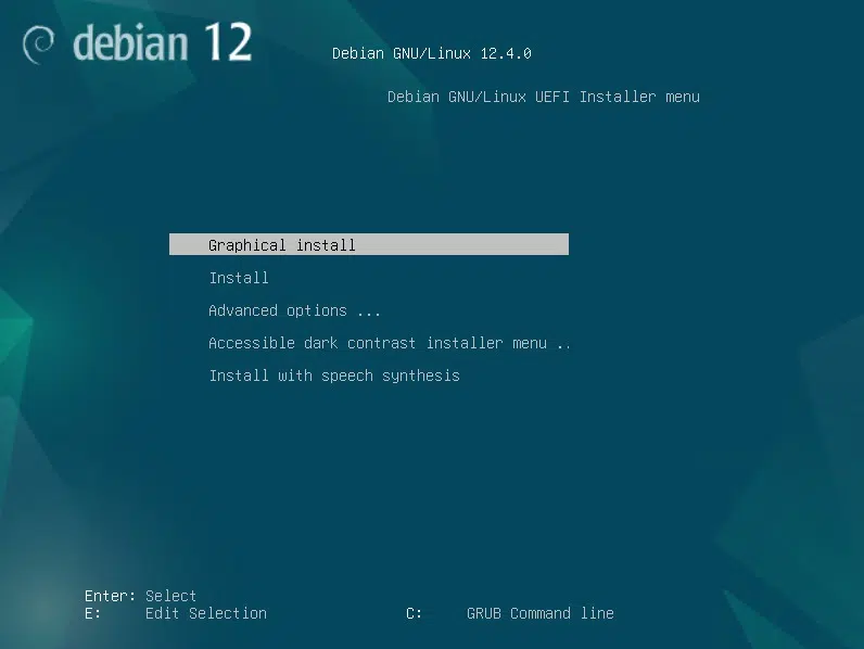 La machine va charger l'image ISO par le réseau. Nous arrivons sur le programme d'installation de Debian 12 :