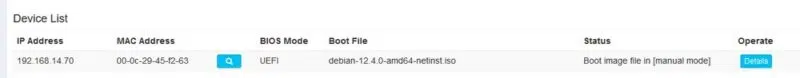 Dans le même temps, côté serveur iVentoy, la section "Device List" présente dans "Boot Information" liste toutes les machines en cours de déploiement. La colonne "Status" est intéressante, car elle indique où en est la machine et notamment l'image de démarrage sélectionnée.