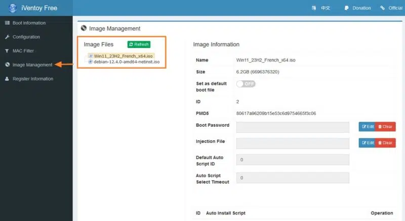 Ensuite, à partir de l'interface web, cliquez sur "Image Management". Vous devriez voir apparaître vos images ISO. En cliquant sur une image ISO, nous accédons à plusieurs options, notamment pour :
