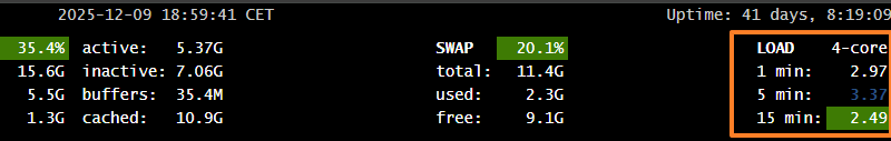 1.00signifie que le processeur est occupé à 100%. Si la charge monte à2.00, cela signifie qu'il y a deux fois plus de travail que le processeur ne peut en traiter, soit une charge potentielle de 200% : une file d'attente se forme obligatoirement. - Sur un système quad-cœur (4 CPU) : une charge de