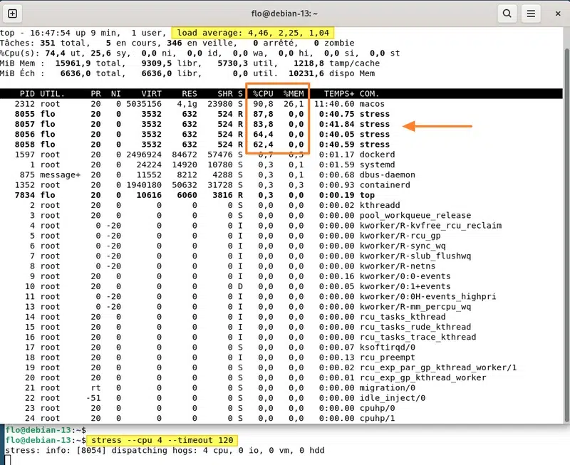 Astuce avec la commande top : appuyez sur la touche 1 de votre clavier pour voir le détail de chaque cœur CPU.
