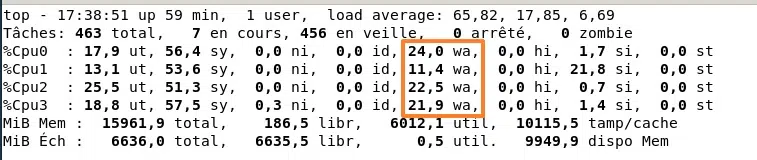 Ici, avec la commande top, on constate que la charge est très élevée (plus de 65 sur la dernière minute), mais que le CPU se porte bien. Ce qui change en comparaison de la charge CPU, c'est la valeur wa : elle est élevée, c'est un signe intéressant qui montre une saturation au niveau du disque. Avec le test de stress CPU, elle était à 0.