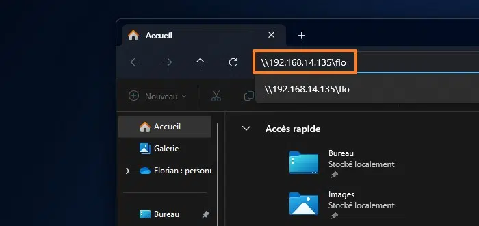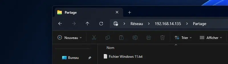 Depuis un poste Windows, via l'Explorateur de fichiers, toujours dans la barre d'adresse, tapez l'adresse IP ou le nom du serveur Linux et ciblez le partage nommé "Partage". Par exemple : \\192.168.14.135\partage.