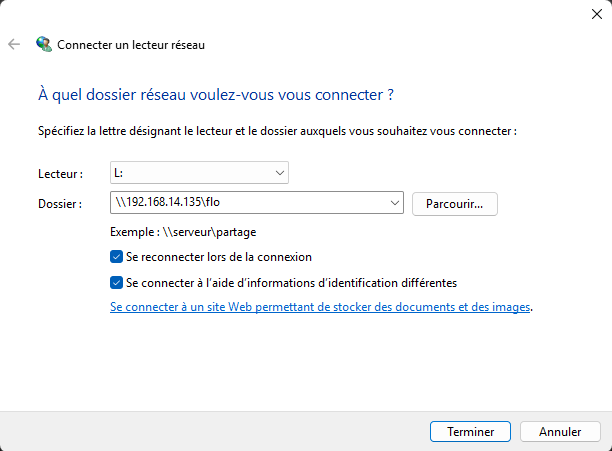 Une autre façon de faire, c'est de connecter un lecteur réseau. L'avantage, c'est que la connexion peut être persistante : le lecteur réseau peut être connecté à chaque fois que la machine Windows démarre. Il apparaît dans l'Explorateur de fichiers de Windows avec une lettre, au même titre que le disque C.