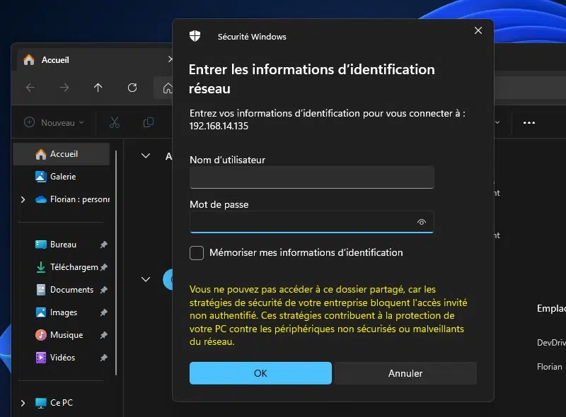 -t cifs: spécifie le type de système de fichiers à utiliser, ici CIFS, soit le SMB//192.168.14.133/Partage: indique l'adresse complète du partage réseau/mnt/partage: indique le point de montage local où le contenu du partage réseau sera accessible une fois monté. Ici, les fichiers du dossier partagé seront visibles dans /mnt/partage.-o: déclarer des options de montageusername=Florian: fournit le nom d'utilisateur pour s'authentifier sur le partage réseau. Ici, il s'agit de l'utilisateur "Florian" existant sur la machine Windows 11.