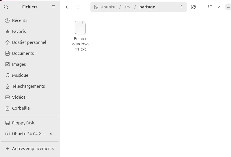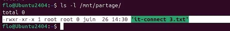 Nous pouvons qu'il y a un fichier dans ce partage (il a été déposé au préalable depuis Windows) : L'inconvénient de cette méthode, c'est que si vous redémarrez la machine, le partage sera inaccessible (il faut le monter à chaque fois).