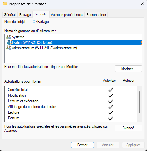 partageest propriétaire du dossier. - Les membres du groupe ont les droits de lecture et d'écriture.