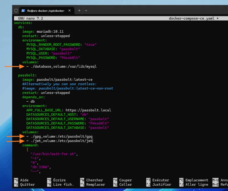 Puis, dans le fichier Docker Compose, vous devez ajouter deux entrées de volumes pour le conteneur Passbolt. Soit :