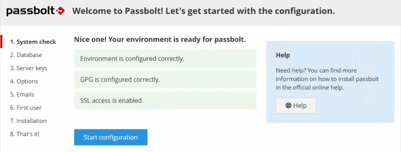 Un assistant de configuration est là pour nous permettre de finaliser l'installation de Passbolt. Cliquez sur "Start configuration".