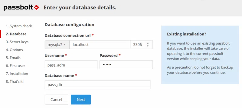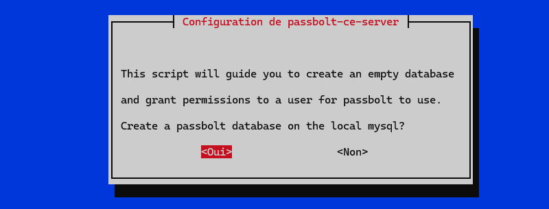 Un assistant est là pour vous guider tout au long de l'installation de Passbolt. On vous invite à créer une base de données sur l'instance MySQL locale. Ici, c'est MariaDB Server qui a été déployé.