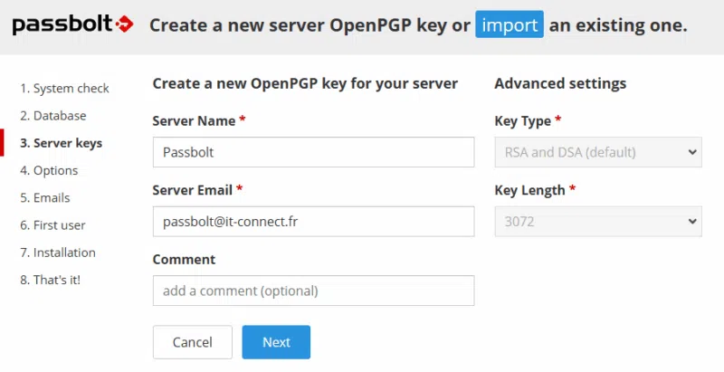 Une nouvelle paire de clés OpenPGP pour le serveur doit être créée. Donnez un nom pour le serveur et une adresse e-mail, puis validez.