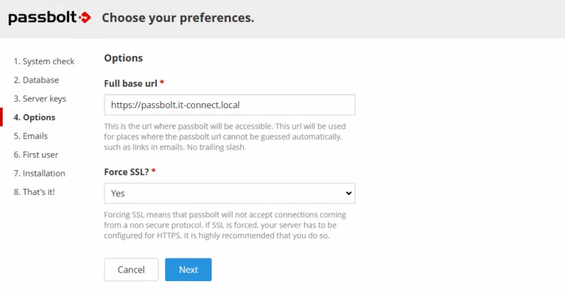 Ensuite, précisez l'adresse complète pour accéder au serveur Passbolt. En principe, l'adresse est déjà renseignée. Vous pouvez aussi forcer le HTTPS en positionnant l'option "Force SSL?" sur "Yes".