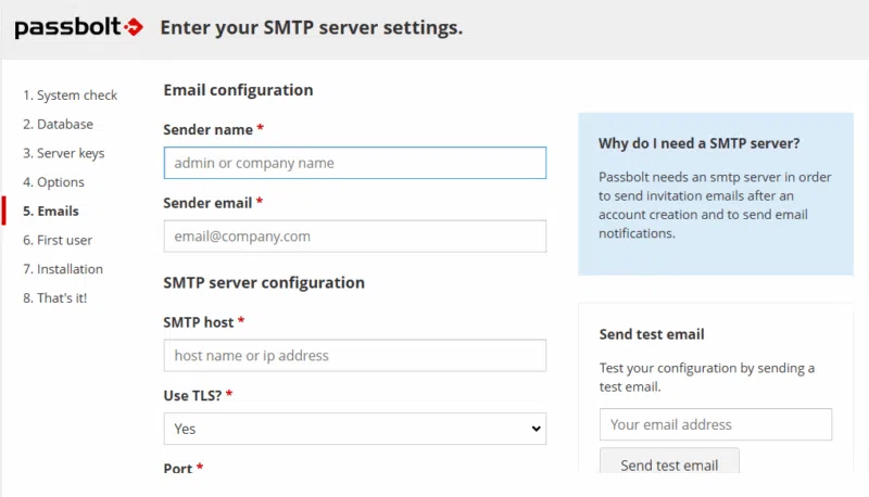À l'étape suivante, configurez les informations de connexion pour envoyer des e-mails : nom du serveur SMTP, adresse e-mail de l'expéditeur, nom du compte pour s'authentifier, etc. Ces informations sont spécifiques à votre environnement. Pensez à tester avec le bouton "Send test email" avant de poursuivre.