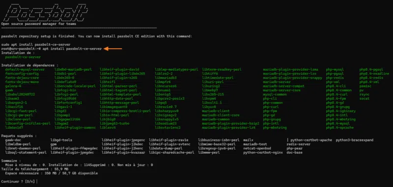 Quand c'est fait, lancez l'installation du serveur Passbolt grâce au paquet passbolt-ce-server.