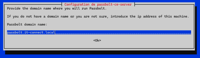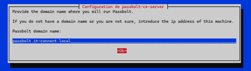 Précisez le nom de domaine (ou l'adresse IP le cas échéant) que vous souhaitez utiliser pour accéder à votre instance. Pour ma part, je vais utiliser le nom passbolt.it-connect.local.