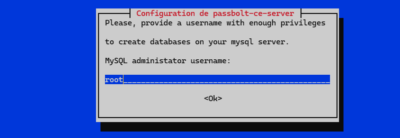 Indiquez le nom du compte d'administration, par défaut root avec MariaDB.