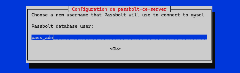 Donnez un nom à l'utilisateur MariaDB qui sera utilisé exclusivement pour la base de données Passbolt. Ici, j'utilise la valeur pass_adm.