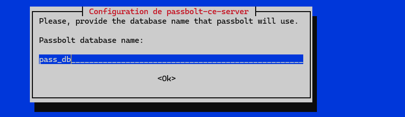 Donnez un nom à la base de données dédiée à Passbolt, ici je précise pass_db.