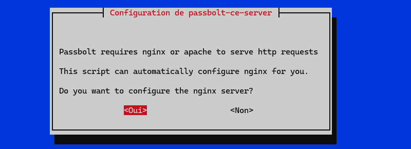 L'assistant nous invite à automatiser l'installation et la configuration de Nginx pour publier l'application. Choisissez "Oui" et validez.