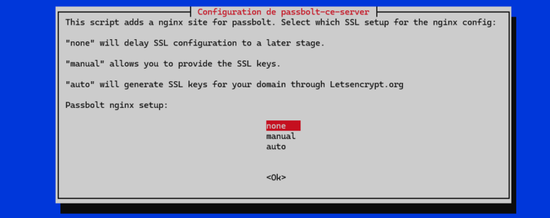 nonepour effectuer la configuration plus tard, c'est ce que nous ferons pour l'instant.manuelpour spécifier le fichier de certificat et le fichier de clé privée dès maintenant.autopour effectuer une demande de certificat via Let's Encrypt (possible si le serveur est accessible depuis Internet).