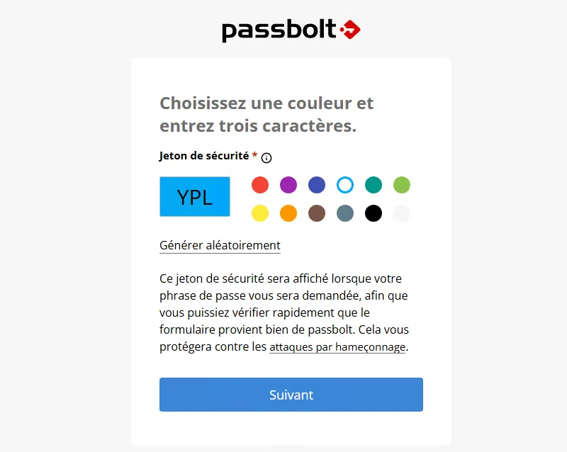 Vous devez ensuite choisir une couleur et définir une valeur basée sur trois caractères. Ces informations sont spécifiques à cet appareil (je dirais même à ce navigateur) et elles seront visibles lors d'une reconnexion, sur ce même appareil, à votre compte Passbolt. En fait, si vous ne voyez pas cette couleur et ce texte lors de la connexion, c'est qu'il y a potentiellement un risque pour la sécurité (phishing, par exemple).