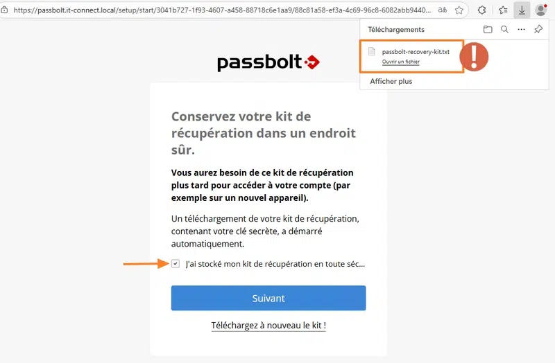 Un fichier nommé passbolt-recovery-kit.txt est téléchargé sur votre PC. Il correspond à votre clé privée PGP. Elle est personnelle, doit être conservée et sauvegardée, et surtout, elle ne doit pas être partagée.