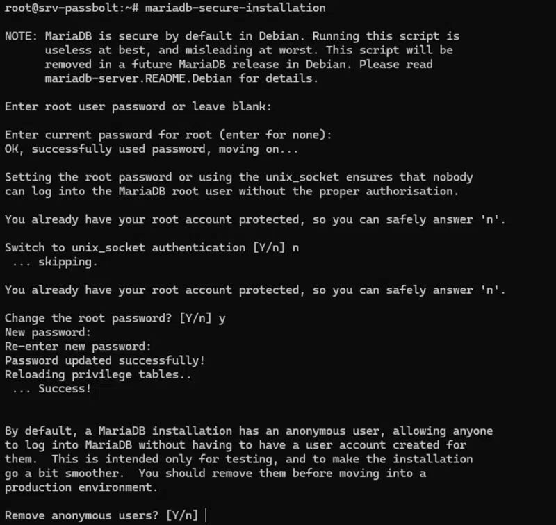 Enfin, avant d'aller plus loin, prenons quelques instants pour effectuer la sécurisation de base de l'instance MariaDB. Exécutez la commande ci-dessous pour appeler le script livré avec MariaDB pour durcir la sécurité : définir un mot de passe root, supprimer les accès anonymes, etc.