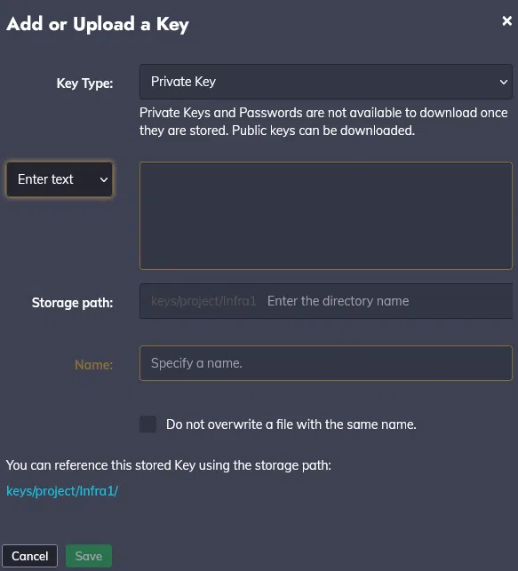Vous pourrez indiquer à Rundeck l'endroit où vous souhaitez que les fichiers de clés SSH ou de mot de passe soient stockés. Par défaut, ils le sont dans /var/lib/rundeck/project/nomduprojet/keys.