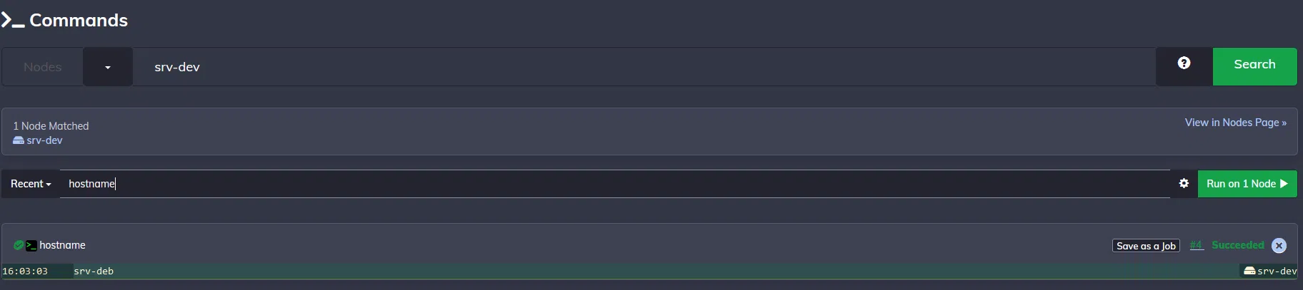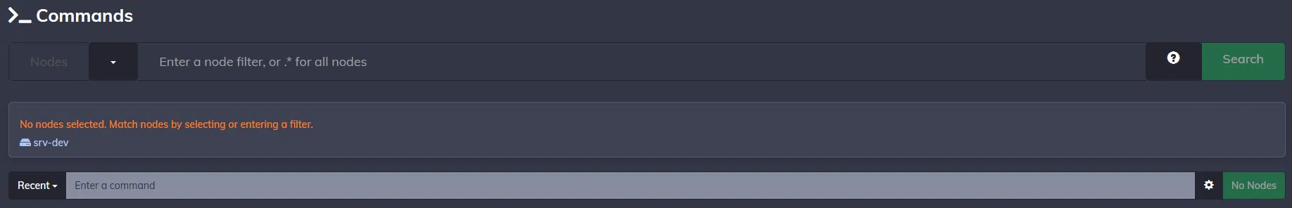 Sauvegardez le fichier. Pour tester le bon fonctionnement, nous allons utiliser la fonction commande, qui permet d'exécuter une commande sur un ou plusieurs nœuds du projet. Pour cela, cliquez sur "Commands" dans le menu de gauche, ce qui vous amènera à cette fenêtre :