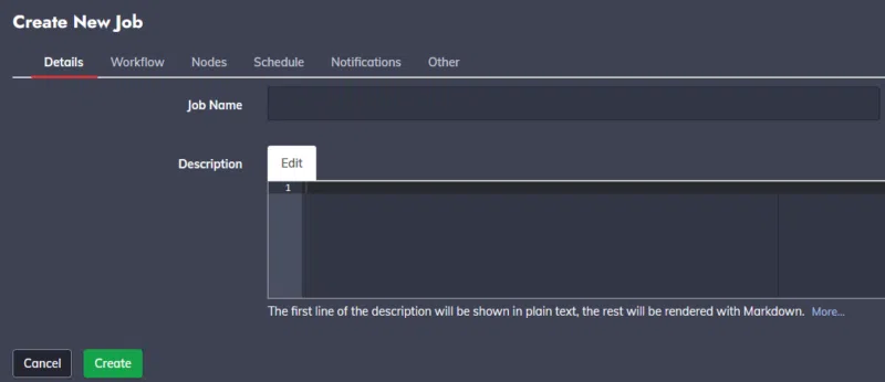 Pour créer un job, cliquez sur "Jobs" dans le menu de gauche, puis sur "Create a New Job", ce qui vous amènera à la fenêtre suivante, sur l'onglet "Details" :