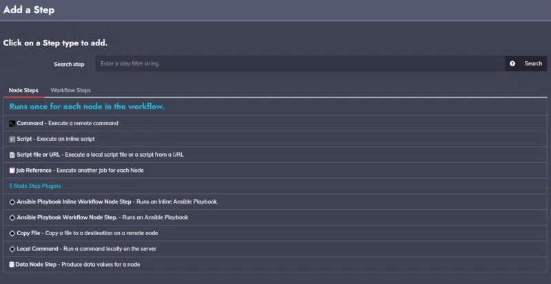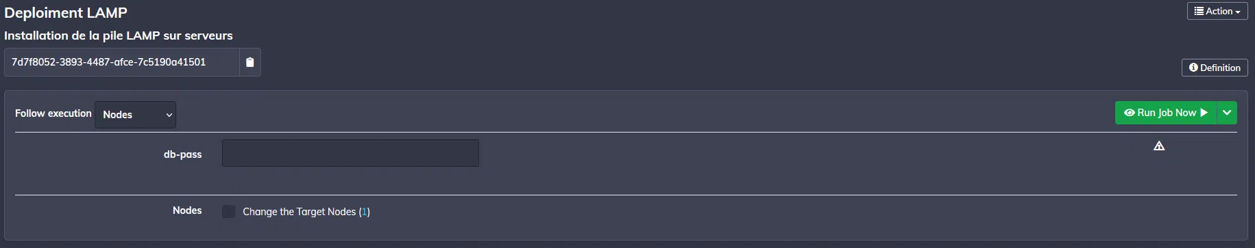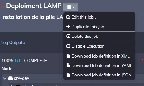 Dans un projet Rundeck, il est question de Job pour les actions faites sur les nœuds, nous pourrions appeler cela des playbooks. Ces jobs vont inclure une suite d'actions qui seront effectuées de manière séquentielle sur un ou plusieurs nœuds, en fonction de ce que vous choisissez.