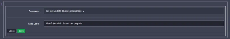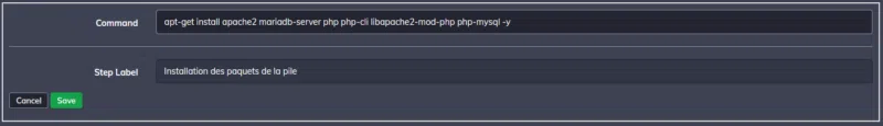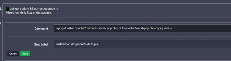 J'enregistre et ensuite, j'installe ce dont j'ai besoin, là encore, pas besoin de script, une commande suffit. Je l'ajoute en cliquant sur "Add A Step" :