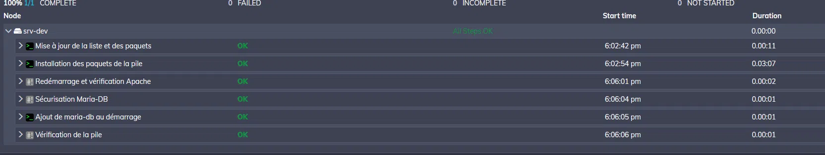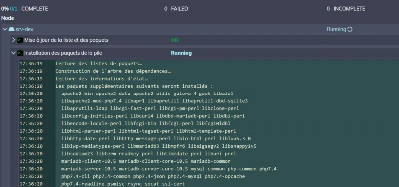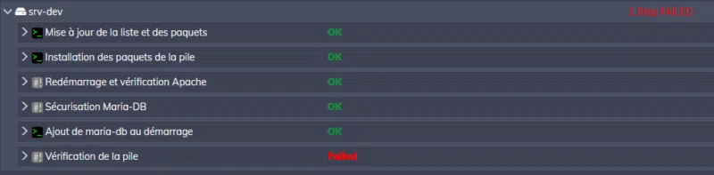 Lorsque celui-ci est lancé, vous pouvez le suivre en déroulant les différentes étapes. Vous pourrez même avoir le retour du terminal du serveur distant, pratique pour débugger !