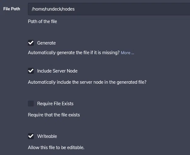Je ne coche pas "Require File Exists" vu que je vais le générer, mais je coche la case "Writable" pour pouvoir ajouter les nœuds depuis Rundeck directement. Si cette cas n'est pas cochée, l'ajout des nœuds devra se faire via SSH ou en console directement sur le fichier, si vous préférez séparer les permissions.