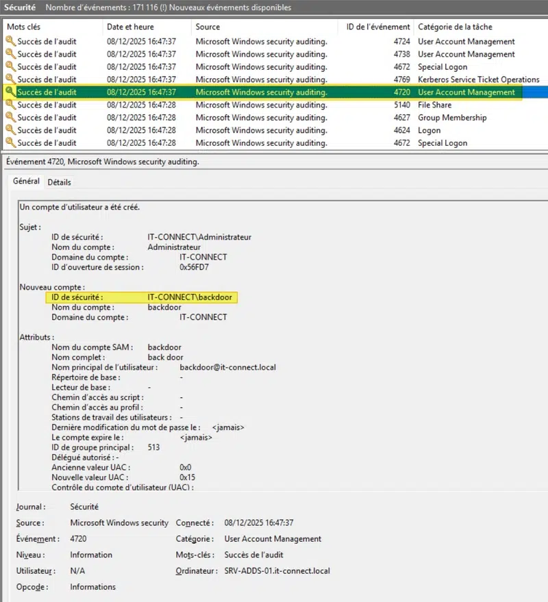 Cette action va générer un ensemble d'événements, à commencer par un avec l'ID 4720. Il précise : Un compte d'utilisateur a été créé. On peut voir que le compte créé s'appelle backdoor et nous avons de nombreuses informations sur les propriétés de ce compte.