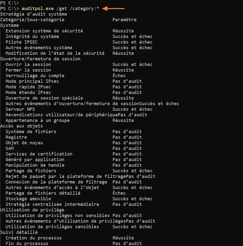 Cette seconde commande permet de vérifier que la stratégie d'audit appliquée correspond bien à la configuration de la GPO.
