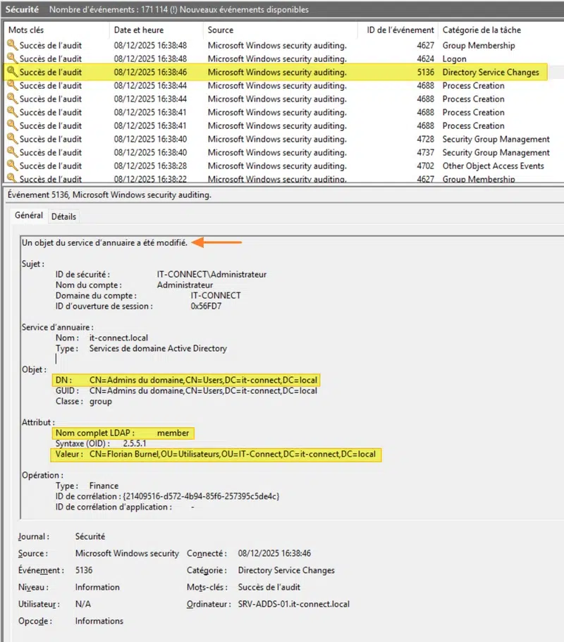 Nous pouvons constater un événement intéressant, avec l'ID 5136 et associé à la source "Directory Service Changes" (lié à "Accès DS" dans la GPO). Le message précise : Un objet du service d'annuaire a été modifié. Mieux encore, nous savons qui a effectué la modification, à quel moment, et surtout la modification effectuée. Ici, on peut voir que l'attribut LDAP member du groupe "Admins du domaine" a été modifié pour ajouter un compte dont le Common Name est florian.burnel.